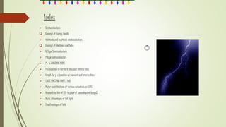 This document provides an overview of semiconductors and light emitting diodes (LEDs). It discusses the concept of energy bands in semiconductors and defines intrinsic and extrinsic semiconductors. N-type and P-type semiconductors are introduced along with the PN junction diode. The document then describes how LEDs work as PN junction diodes that emit light when forward biased. It discusses the contributions of scientists to developing LEDs and their advantages over incandescent lamps, such as energy efficiency and long lifetime. Some disadvantages of LEDs include higher initial costs and potential color shifts over time.