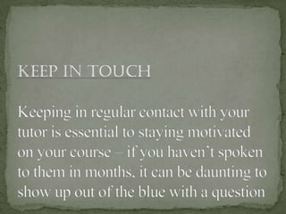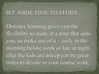 Distance learning provides greater educational opportunities by allowing students to learn remotely using online resources. It offers flexibility so students can learn while working or managing other responsibilities. There are both synchronous courses that require simultaneous participation and asynchronous courses that are more self-paced. While distance learning has benefits like lower costs, flexibility, and access to more school choices, it also has drawbacks like lacking social interaction and requiring adaptability to new technologies. Some employers also do not accept online degrees.