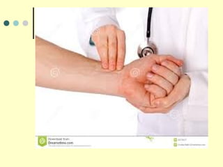 This document provides an overview of conducting a general physical examination of a patient. It discusses the importance of gathering information about the patient's history, including their chief complaint, medical history, habits, and vital signs. The physical examination involves inspection, palpation, percussion, and auscultation of the patient to assess their general appearance, skin, vital signs and build. Proper examination techniques are emphasized.