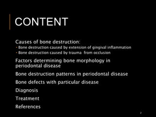 The document discusses the causes and mechanisms of periodontal bone defects, detailing the extent of bone destruction due to gingival inflammation and trauma from occlusion. It outlines patterns of bone destruction, classification of defects, and the impact of periodontal disease on bone morphology, including various types of bone loss and treatment approaches. The document emphasizes the importance of understanding these factors for effective diagnosis and management of periodontal conditions.