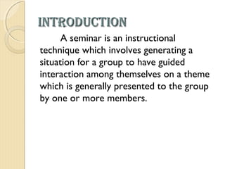 This document discusses the seminar method of instruction. It defines a seminar as involving a group guided discussion on a theme presented by one or more members. The objectives are to develop higher cognitive abilities like analysis and evaluation, as well as affective objectives like tolerance of other ideas and cooperation. Key roles in a seminar include the organizer, president, speaker, participants, and observers. The seminar method stimulates thinking and develops openness while representing behavioral norms. It is used in higher education to clarify complex topics.