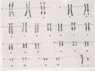 This document provides information about genetics, genetic inheritance, and chromosomal disorders. It defines key genetic terms like gene, allele, DNA, RNA, genetic code, and mutation. It describes different patterns of genetic inheritance such as autosomal dominant, autosomal recessive, X-linked recessive, and multifactorial inheritance. It also discusses different types of chromosomal abnormalities including aneuploidy, structural abnormalities like translocations, deletions, and inversions. Specific genetic and chromosomal disorders are described like Down syndrome, Klinefelter syndrome, and others. The document is a guide to genetics and chromosomal disorders.