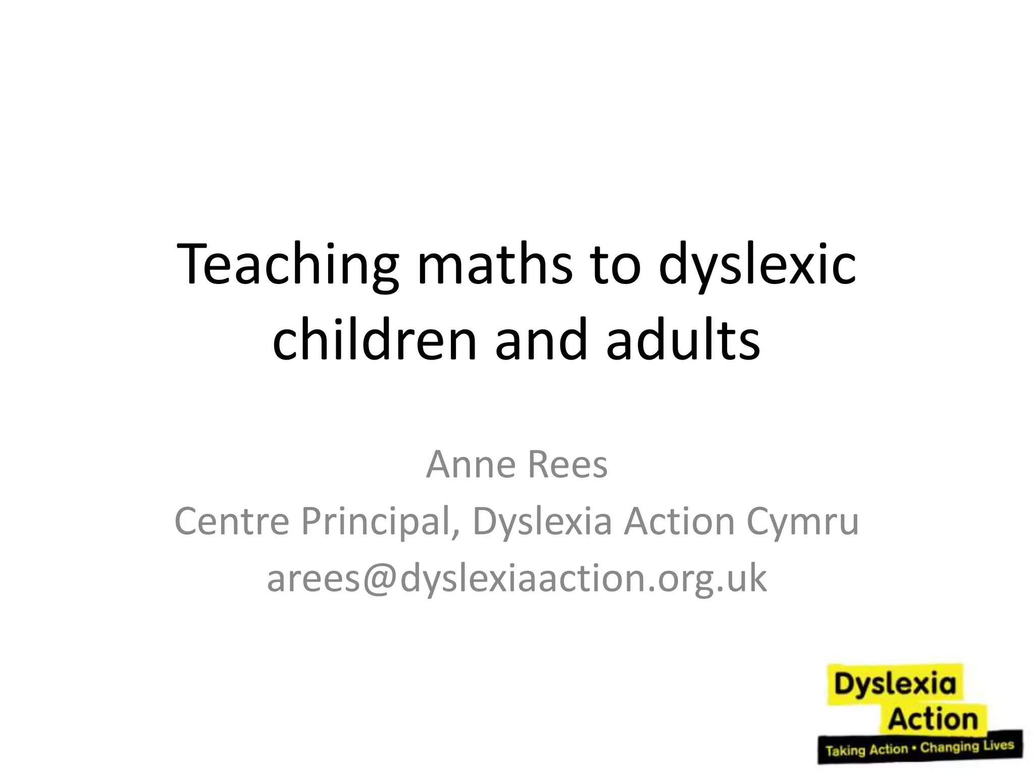 This document discusses teaching math to dyslexic children and adults. It notes that dyslexic students often struggle with math due to weaknesses in language, memory, processing speed, spatial awareness, and other areas. The document recommends using concrete materials, counting activities, number bonds, place value, and estimation to make math more accessible. It also suggests assessing students' math skills and using apps to support learning. The overall message is that dyslexic learners need flexible number skills and to develop number sense through hands-on activities.