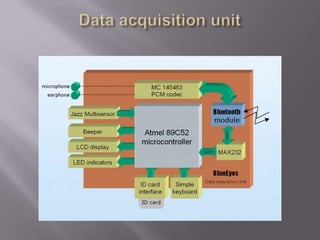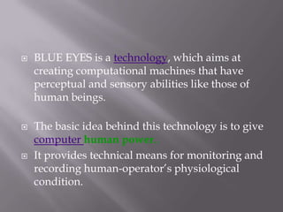 The document describes BLUE EYES, a wireless monitoring system that aims to monitor physiological parameters and brain activity of human operators to prevent disasters from human error. It consists of a lightweight data acquisition unit worn by the operator with sensors, and a central system unit that analyzes the collected data and monitors for alarm conditions. Bluetooth technology is used to wirelessly transmit the sensor data from the operator to the central system for real-time monitoring and recording of the operator's condition.