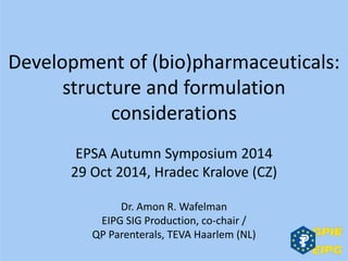 The document presents insights from the EPSA Autumn Symposium 2014 on the development of biopharmaceuticals, highlighting key aspects such as formulation considerations, biosafety, and immunogenicity challenges. It discusses the evolution from small molecules to complex proteins, emphasizing clinical trial data and the significance of proper formulation and delivery methods. The content also covers recent advancements in drug development, including liposomal formulations and pegylation techniques.