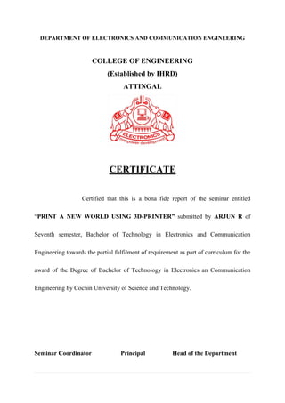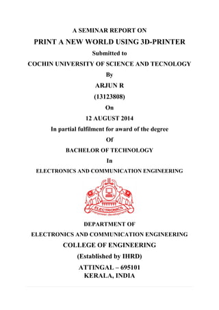 The document is a seminar report submitted by Arjun R on the topic of 3D printing, detailing its technology, applications, and potential benefits across various industries. It covers the fundamentals of additive manufacturing technology, methods, and the impact on manufacturing processes, highlighting cost efficiency and design innovation. The report includes acknowledgments, an abstract, and a comprehensive breakdown of the seminar's structure, including sections on technologies, advantages, and future developments in 3D printing.