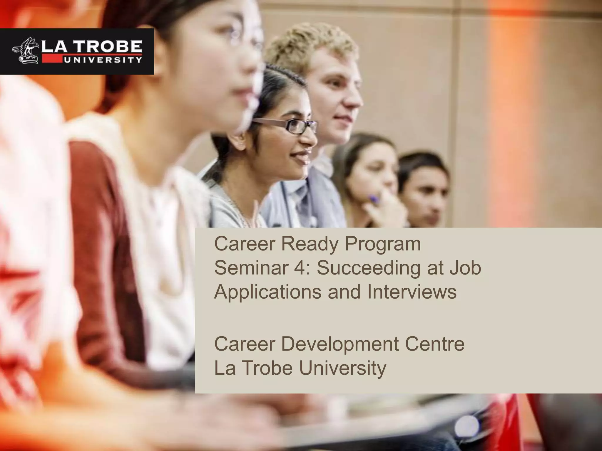 The document outlines a seminar on succeeding at job applications and interviews, detailing effective resume writing and cover letter creation. Key points include tailoring resumes to specific jobs, presenting achievements, addressing key selection criteria, and preparing for interviews using the STAR method. It emphasizes the importance of research, preparation, and non-verbal communication in the interview process.