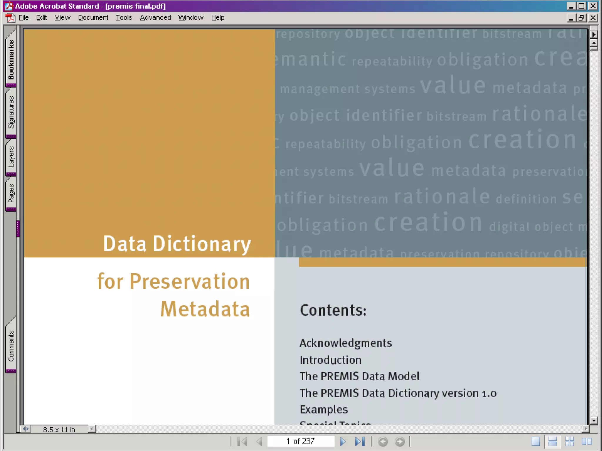 The document presents an overview of the OAIS (Open Archival Information System) model, which is a framework for digital preservation, focusing on its definitions, responsibilities, and functional model. It details the conceptual structures for information management within archives, including the roles of information packages and preservation metadata. Furthermore, the implementation and compliance of the OAIS model in existing digital repositories is discussed, highlighting its significance in guiding system design and enhancing archival practices.