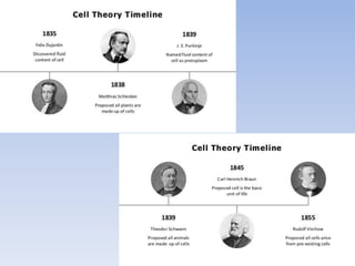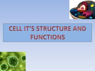 The document discusses the structure and function of cells. It defines the cell as the basic structural and functional unit of living organisms. The modern cell theory states that all living things are made of cells, cells are the basic units of structure and function, all cells come from preexisting cells, and all cells contain DNA. The document then describes key aspects of cell structure, including the cell membrane, cytoplasm, organelles, cytoskeleton, and nucleus. It also summarizes several important cell functions such as transport, digestion, synthesis of cellular structures, energy production, and movement.