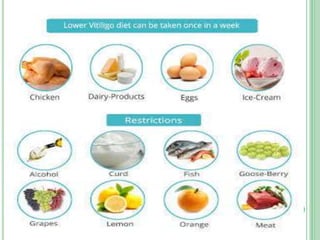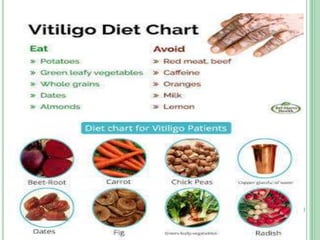Vitiligo is a long-term skin condition characterized by patches of skin losing pigment, resulting in white patches with sharp borders. The cause is unknown but is believed to involve genetic susceptibility triggering an autoimmune response that destroys skin pigment cells. Risk factors include family history of autoimmune diseases. Treatment options aim to repigment the skin through topical steroids, phototherapy, or cellular grafting for segmental vitiligo. While there is no cure, combining treatments may provide improved management of symptoms and quality of life for patients.