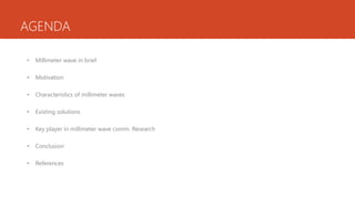 The document discusses millimeter wave (mmwave) technology, which operates at frequencies between 30 and 300 GHz, crucial for the development of 5G networks that promise faster data speeds and more reliable service. It highlights the characteristics and challenges of mmwaves, including propagation loss and sensitivity to obstacles, and introduces solutions like small cells, massive MIMO, beamforming, and full duplex technology to enhance mmwave communication. Key researcher Theodore Rappaport emphasizes mmwave's potential to significantly improve wireless bandwidth, suggesting its feasibility for future communication systems.