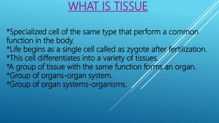 This document provides an overview of the four major types of animal tissue: epithelial, connective, muscle, and nervous tissue. It discusses the structure and functions of each tissue type. Epithelial tissue covers and lines body surfaces and forms glands. Connective tissue binds organs together and provides support. Muscle tissue enables movement and includes three types: smooth, cardiac, and skeletal. Nervous tissue is composed of neurons that sense stimuli and transmit electrical signals throughout the body.