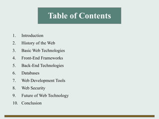The document provides an overview of web technology, covering its history, basic technologies, front-end and back-end frameworks, databases, development tools, security, and future trends. Key milestones include the introduction of HTML, JavaScript, and CSS, along with the rise of various frameworks and languages for web development. It emphasizes the continuous evolution of the field and the importance of staying updated for developers.