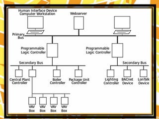 3) Building automation systems are an example of distributed control systems that use sensors, controllers and networks to automatically control a building's mechanical, lighting and other systems to improve efficiency and occupant experience.