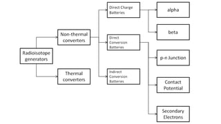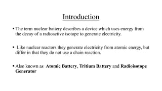 This document summarizes a seminar presentation on nuclear batteries. It begins by defining a nuclear battery as a device that uses energy from radioactive decay to generate electricity without a chain reaction. It then discusses the evolution of the technology from 1913 to modern applications. It categorizes the conversion techniques used as either thermal or non-thermal and provides examples of technologies within each category. It concludes by discussing advantages and disadvantages of nuclear batteries and potential applications.