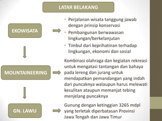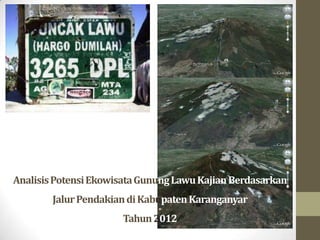 Penelitian ini menganalisis potensi dan pengembangan jalur pendakian Gunung Lawu di Kabupaten Karanganyar, dengan fokus pada faktor pendukung dan penghambat. Ditemukan bahwa banyak jalur pendakian yang belum dikelola secara optimal, meskipun Gunung Lawu memiliki potensi wisata yang tinggi. Tujuan penelitian adalah memberikan informasi bagi pengembangan kebijakan wisata alam di daerah tersebut.
