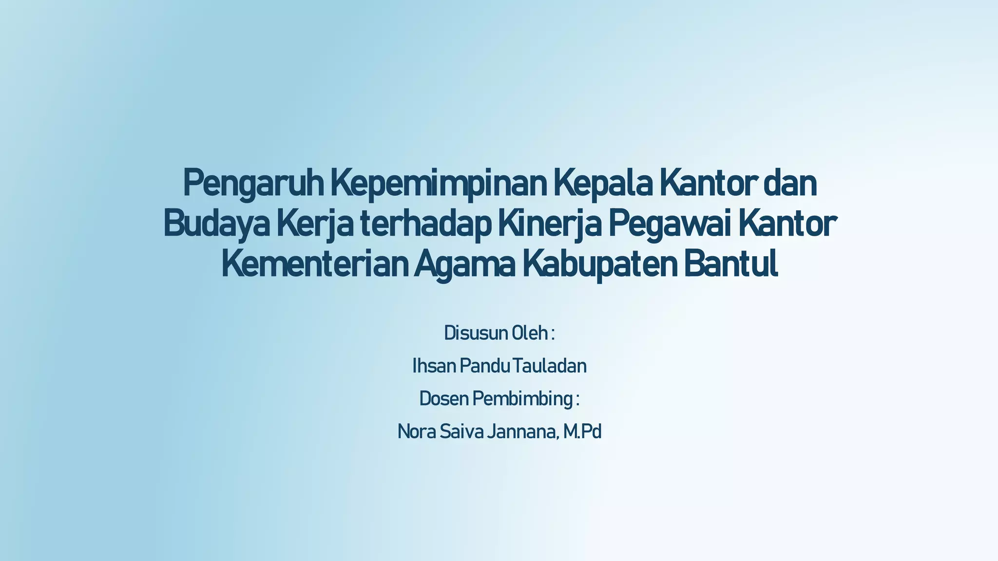 Dokumen ini membahas pengaruh gaya kepemimpinan dan budaya kerja kepala kantor terhadap kinerja pegawai di Kementerian Agama Kabupaten Bantul. Penelitian ini bertujuan untuk mengetahui pengaruh kepemimpinan dan budaya kerja terhadap kinerja pegawai serta manfaat hasil penelitian bagi peningkatan kinerja.