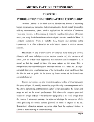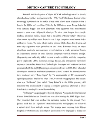Motion capture technology involves recording human movements and translating them onto digital models. There are several types of motion capture techniques, including optical, mechanical, and magnetic. Optical motion capture uses multiple cameras to track passive or active markers placed on an actor's body. Early motion capture systems involved tracing live-action footage frame-by-frame (rotoscoping). Modern optical systems can capture high-resolution movement data at fast frame rates.