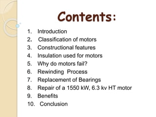 This document summarizes a seminar presentation on the study and repair of motors. It discusses the classification, construction, common failures and insulation of motors. It then describes the rewinding process, bearing replacement, and provides a case study on repairing a 1550 kW HT motor by cutting out the damaged portion and brazing in a new copper strip instead of full rewinding, saving costs and downtime. In conclusion, careful examination and using better materials can improve motor repairs economically.