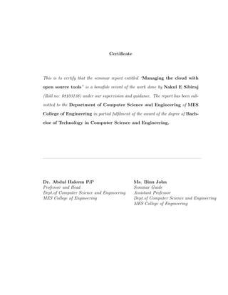 This document discusses managing the cloud with open source tools. It provides an overview of cloud computing, including its key characteristics like elasticity and pay-per-use model. It also covers open source philosophy and the importance of open source tools for cloud management. The document evaluates several popular open source provisioning, configuration, automation and monitoring tools used for cloud management. It concludes that while cloud computing provides benefits, effective management is still needed and open source tools can help organizations manage their cloud resources.