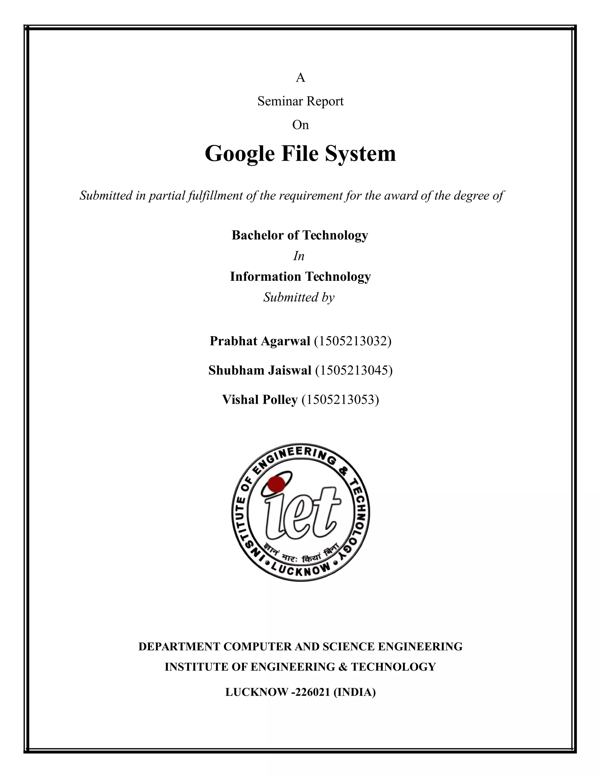 The document is a seminar report on the Google File System (GFS), detailing its design, architecture, and operational algorithms, submitted as part of a Bachelor of Technology degree requirement. The GFS is a scalable distributed file system created by Google to efficiently manage large data applications using inexpensive commodity hardware, emphasizing fault tolerance, high availability, and optimized performance for large files. Key design features include a hierarchical structure, chunk-based storage, and a master-server model for metadata management.
