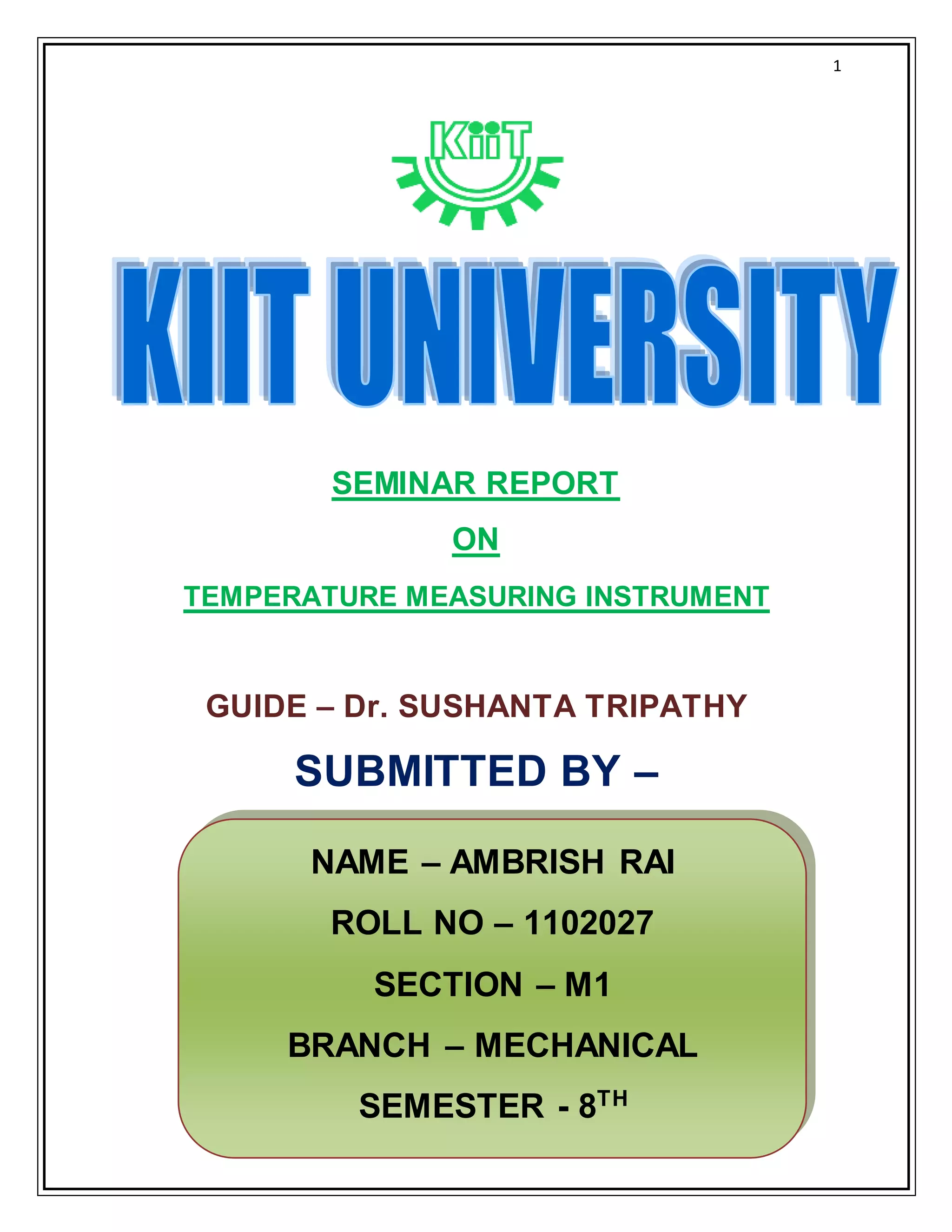 Ambrish Rai submitted a seminar report on temperature measuring instruments to his guide Dr. Sushanta Tripathy. The 3-page report discussed various temperature scales including Fahrenheit, Celsius, and Kelvin. It also described common temperature measurement devices such as liquid-in-glass thermometers, bimetallic thermometers, resistance temperature detectors, and pyrometers. For each device, the report outlined the basic construction, principles of operation, advantages, and disadvantages.