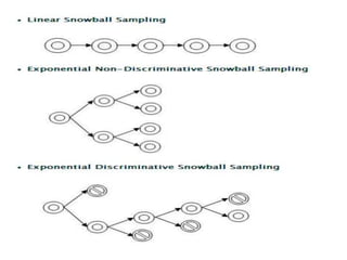 This document discusses different sampling methods used in research. It defines key terms like population, sample, sampling unit and frame. It explains the difference between probability and non-probability sampling. Probability methods discussed include simple random sampling, systematic sampling and cluster sampling. Advantages of probability sampling are an absence of bias and minimal sampling errors. Non-probability methods are useful when the population is homogeneous or operational considerations are important. The document provides details on how to implement simple random and systematic random sampling techniques.