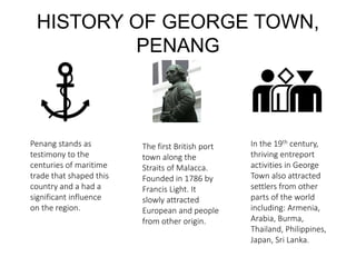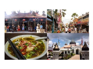 George Town in Penang, Malaysia was designated a UNESCO World Heritage Site in 2008 due to its unique architectural and cultural townscape reflecting the blending of Malay, Chinese, Indian and European influences. The document discusses the challenges facing the preservation of George Town's heritage character, including development pressures, non-compliance with conservation guidelines, and gentrification. Key approaches to overcoming these challenges include adaptive reuse of historic buildings for new purposes, restoration work to repair and restore buildings to their original state, and ensuring new developments are sensitive to the historic context. Successful examples provided are the adaptive reuse of the Syed Al-Attas Mansion as the Penang Islamic Museum and the Rumah Teh Bunga mansion as the Penang