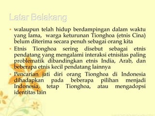 Dokumen ini membahas peran tokoh Tionghoa di Perkumpulan Masyarakat Surakarta (PMS) dalam membina kerukunan antaretnis di Surakarta, termasuk sumbangan mereka dalam bidang pendidikan dan kegiatan sosial. Meskipun mengalami tantangan sebagai etnis minoritas, tokoh-tokoh ini aktif membangun jaringan dan menjalankan berbagai program untuk mendukung masyarakat. Penelitian ini menggunakan pendekatan kualitatif untuk menggali lebih dalam mengenai dinamika interaksi dan keberadaan mereka dalam masyarakat.