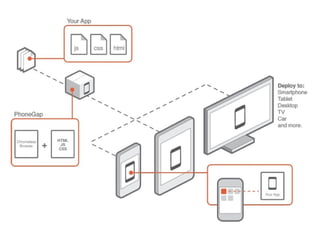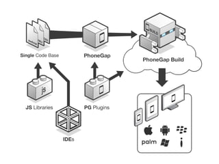 - Cross platform mobile app development allows building apps that can run on multiple operating systems like iOS, Android, Blackberry etc using a single codebase. This is done through frameworks like PhoneGap that allow using web technologies like HTML, CSS and JavaScript but also provide access to device capabilities via plugins.