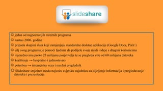 Slideshare je mrežni program nastao 2006. godine koji omogućuje dijeljenje prezentacija i dokumenata uz preko 23 milijuna mjesečnih posjetitelja. Korisnici mogu objavljivati, slati, spremati i komentirati prezentacije, dok alate koristi u obrazovanju za interaktivno učenje i suradničke aktivnosti. Program olakšava pristup materijalima iz nastave i potiče dvosmjernu komunikaciju između učitelja i učenika.