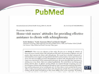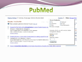 The document discusses competencies in health sciences information and summarizes the results of a search on schizophrenia and residential or home care services. The search yielded 361 articles published in the last 10 years, of which 59 references were imported into RefWorks. The references are listed and include studies on quality of life for patients and relatives in Turkey, benefits of boarding home placement, a family intervention study in China, assessment of long-term psychotic patients in Australia, caregiver burden and coping in India, and nurses' attitudes towards clients with schizophrenia in Japan.