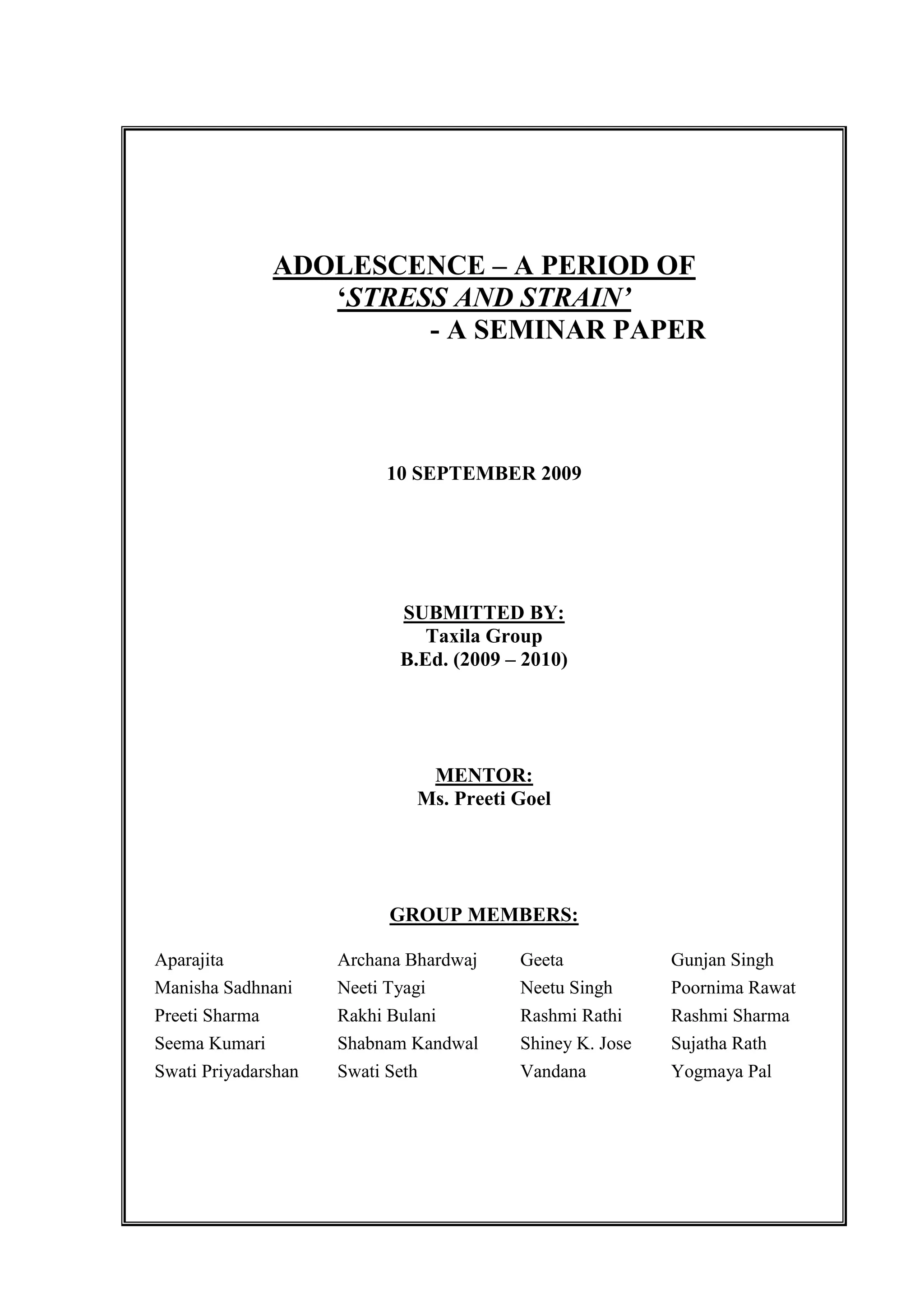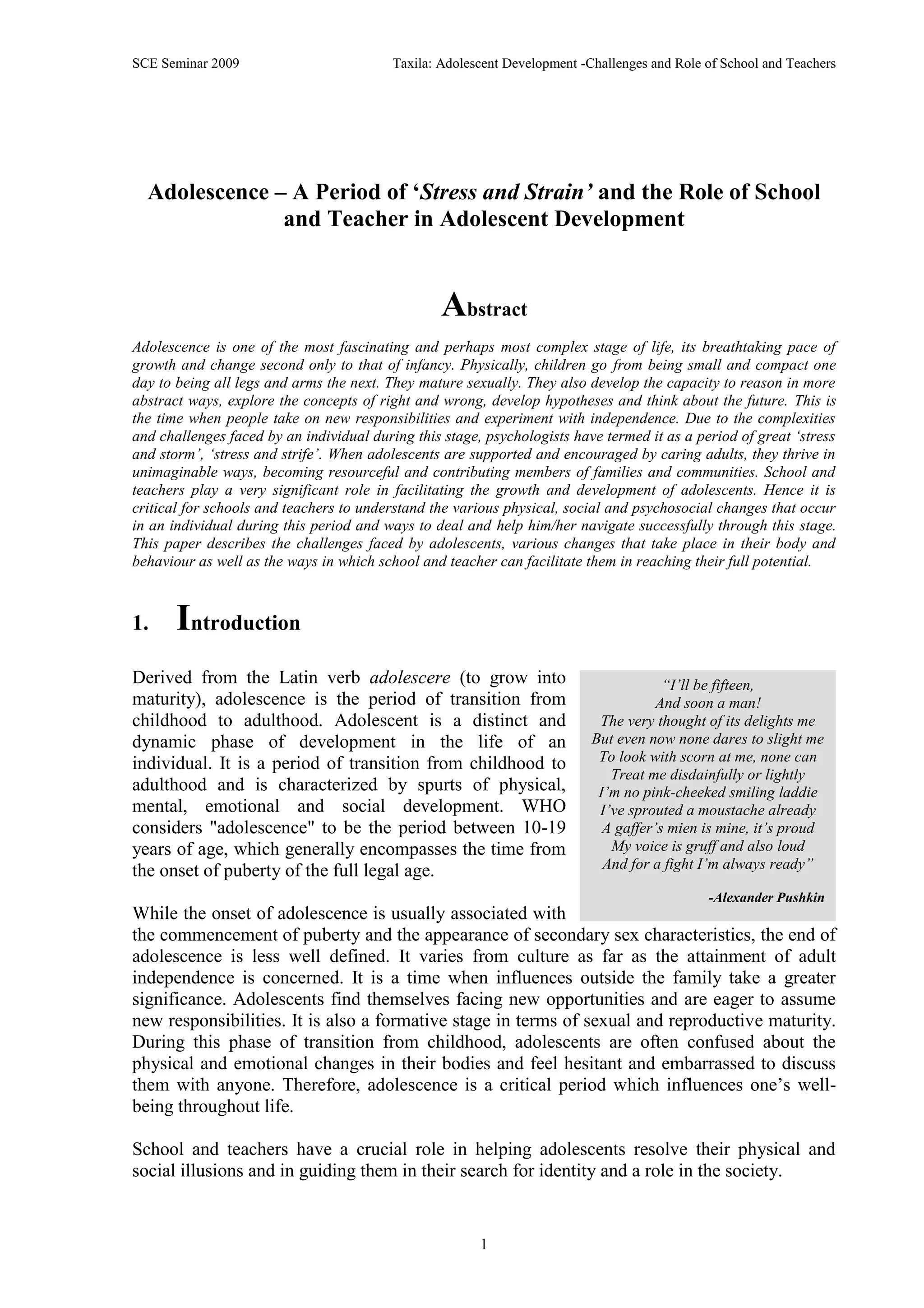 The document provides an overview of adolescence as a period of "stress and strain" and the role of schools and teachers in facilitating adolescent development. It discusses adolescence as a transition period between childhood and adulthood characterized by rapid physical, social, and psychological changes. These changes cause stress and confusion for adolescents. The summary highlights the physical changes of puberty, social development including increased importance of peers, and psychosocial challenges in establishing identity. It also outlines ways schools and teachers can support adolescents, such as through physical education, nutrition education, medical checkups, and sex education.
