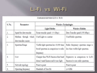This document summarizes a presentation on Li-Fi technology. It begins with an introduction and overview of Li-Fi, noting that it uses visible light communication and LED bulbs to transmit data. It then discusses the history of Li-Fi, including the first public demonstration in 2011. The document outlines the basic working process and construction of Li-Fi systems. It compares Li-Fi to Wi-Fi and discusses some applications. The document also briefly mentions security benefits and challenges facing Li-Fi development, such as the need for line of sight transmission. It concludes by stating that Li-Fi could provide a high-speed wireless alternative to congested radio frequencies.