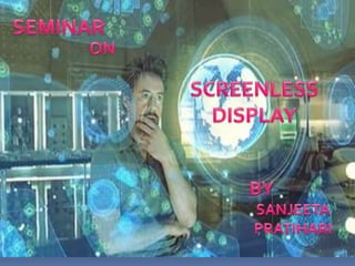 The document discusses different types of screenless displays, including visual image displays, retinal displays, and synaptic interfaces. Visual image displays use holograms, VR goggles, or heads-up displays to project images. Retinal displays project images directly onto the retina using lasers and beam scanning. Synaptic interfaces send information directly to the brain without using light. Screenless displays offer benefits like high resolution and brightness but current technologies have high costs and limited availability.