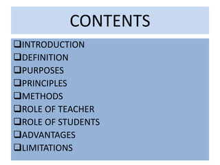 This document outlines the key aspects of seminars as a teaching method. It defines a seminar as an interactive group discussion, typically involving 10-20 students, where one student presents a paper for 15-20 minutes to be discussed. The purposes of seminars are to promote independent and critical learning, student involvement, and a sense of responsibility and community. The roles of the teacher are to structure discussions and ensure all students participate, while students are responsible for leading discussions and organizing seminars. Advantages include active learning, analytical thinking, and communication skills, while the main limitation is the time-consuming nature of seminars.