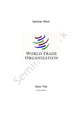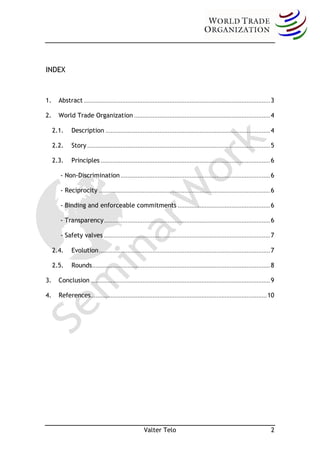 The document provides information about the World Trade Organization (WTO) in several sections. It describes the WTO as an international organization that promotes and enforces rules of trade between nations. Key details include that the WTO has 153 member countries and was established in 1995 after negotiations during the Uruguay Round replaced the General Agreement on Tariffs and Trade (GATT). The document also outlines the principles of non-discrimination, reciprocity, binding commitments, transparency and exceptions that guide the WTO.
