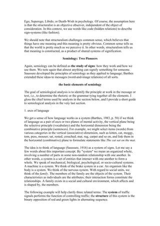 This document provides an overview of semiology and structuralism. It defines semiology as the study of signs and how they are used to convey messages. Structuralism views phenomena through structures and relations rather than causes. Some key aspects of semiology discussed include: signs being made up of a signifier and signified; motivated vs unmotivated signs; denotation vs connotation; and the three orders of signification.