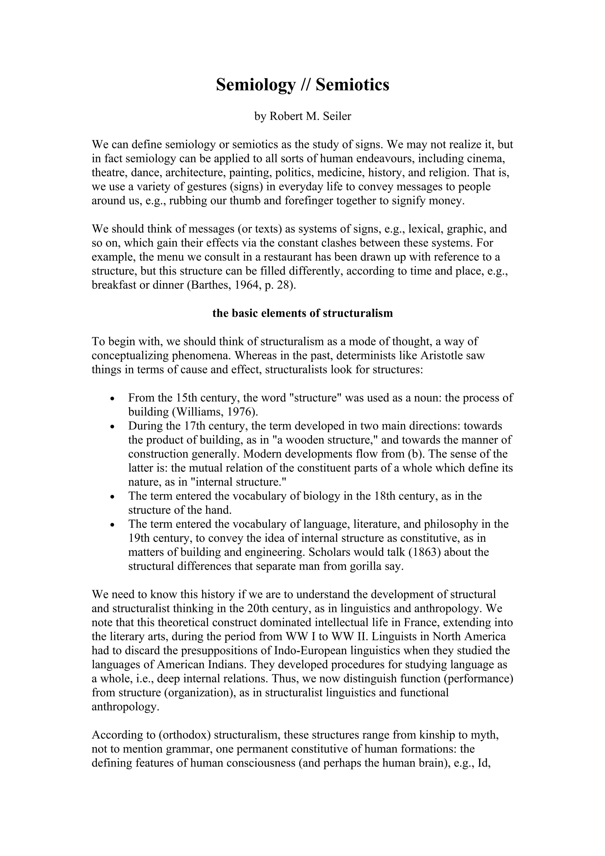 This document provides an overview of semiology and structuralism. It defines semiology as the study of signs and how they are used to convey messages. Structuralism views phenomena through structures and relations rather than causes. Signs are composed of a signifier and signified. Meaning is constructed through shared sign systems rather than reflecting objective reality. The document outlines various concepts in semiology, including denotation vs connotation and the different orders of signification.