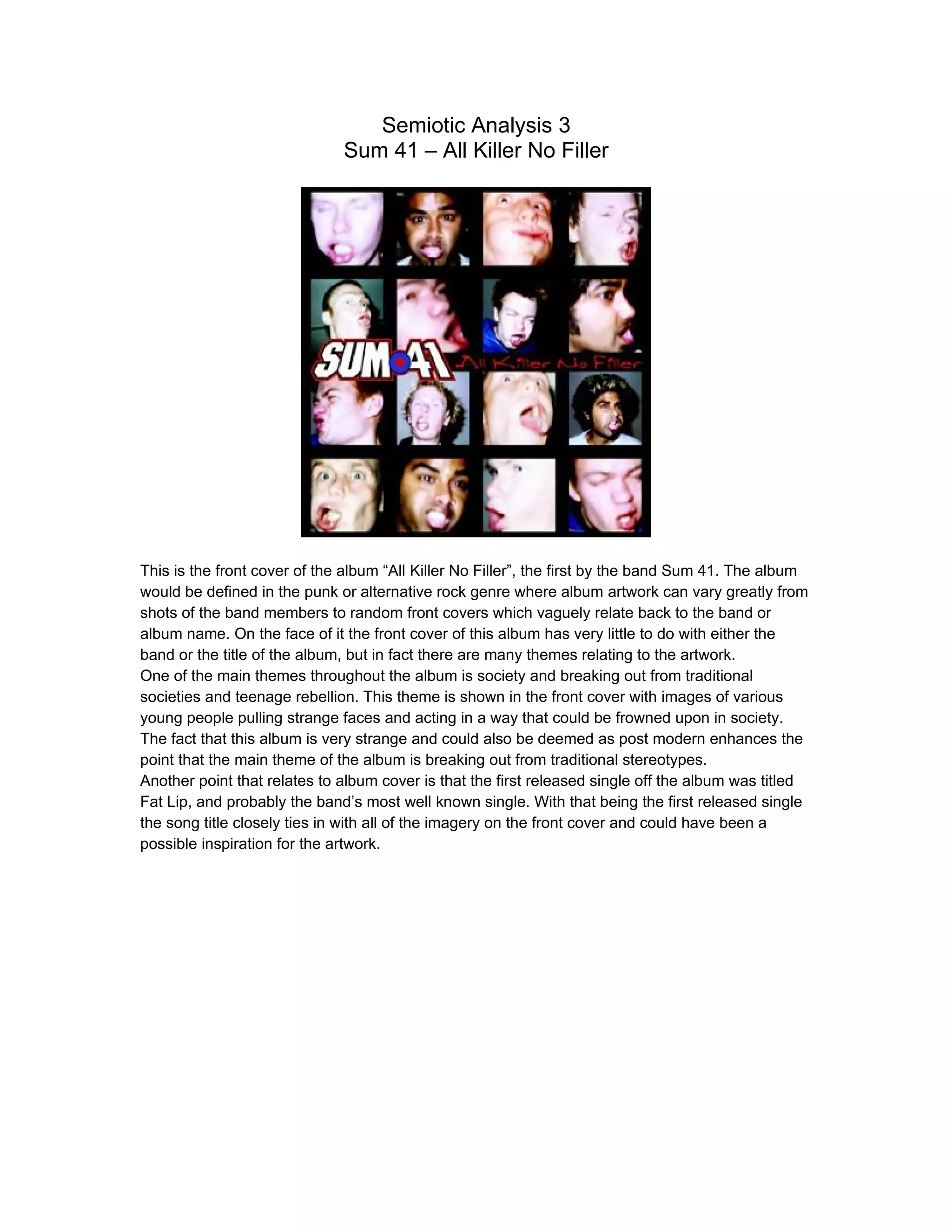The front cover of Sum 41's album "All Killer No Filler" features images of young people making strange faces and acting in ways that rebel against societal norms, reflecting the album's themes of teenage rebellion and breaking from tradition. Though seemingly random, the cover relates to the album's exploration of individualism outside expectations. It may have also been inspired by the band's hit single "Fat Lip", the title of which connects to the photos on the cover.