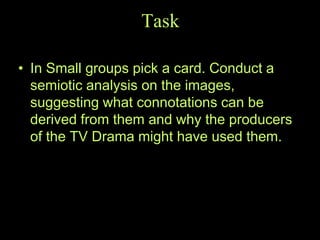 This document introduces semiotic analysis, which examines the relationship between referents (the thing being referred to), signifiers (the form used to represent it), and signifieds (the concept brought to mind). It explains that semiotics operates on the levels of denotation (literal description) and connotation (implied meaning). Students are then asked to work in groups, analyzing images on cards for their connotations and how those connotations might be used by TV drama producers.