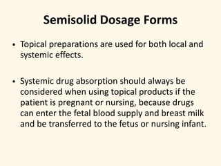 The document discusses semisolid dosage forms such as ointments, describing their uses, types of ointment bases, advantages and disadvantages of ointments, preparation methods, and factors to consider when selecting vehicle bases for dermatological formulations. Ointments can be used topically to treat skin conditions and provide local or systemic drug effects depending on the formulation. Selection of the appropriate ointment base depends on factors like absorption, skin compatibility, stability, and consistency.