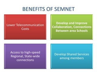Semnet aims to establish a leading telecommunications collaboration in southeastern Minnesota to enhance access to high-speed internet for schools and improve educational services. The document discusses the importance of high-speed broadband for students, teachers, and administrators to enable effective learning and professional development, particularly in rural areas facing a digital divide. It highlights various member districts and the need for robust telecommunications infrastructure to support modern educational tools and resources.