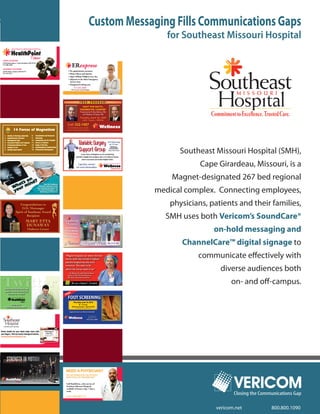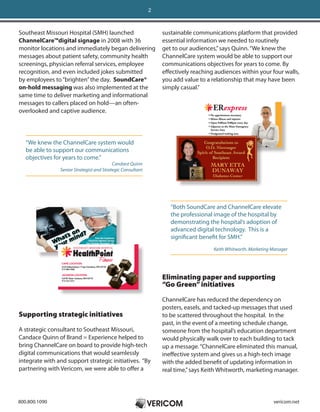 Southeast Missouri Hospital (SMH) implemented Vericom's ChannelCare digital signage and SoundCare on-hold messaging systems to enhance communication among staff, patients, and the community. This platform improves information delivery, supports sustainability initiatives by reducing printed materials, and fosters a professional image through advanced digital technology. Additionally, it aids in preparing staff for surveys and enhances engagement by providing critical, timely messages tailored to various audiences.