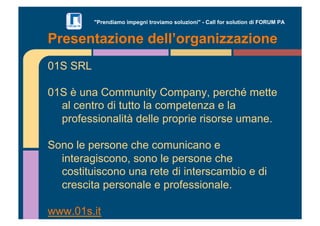 Il progetto 'Semplice' di 01s s.r.l. mira a semplificare le attività amministrative della pubblica amministrazione attraverso un sistema di rating e misurazione delle performance. Attualmente finanziato e in fase di sperimentazione, il progetto coinvolge vari comuni e si propone di migliorare la trasparenza e la conoscenza dei bisogni locali. L'iniziativa prevede un investimento totale di 1.200.000 euro e sarà realizzata in due anni, dal 2013 al 2014.