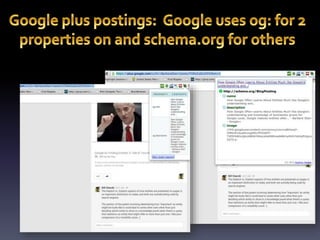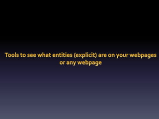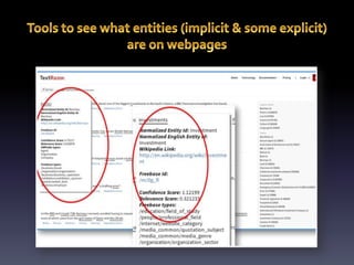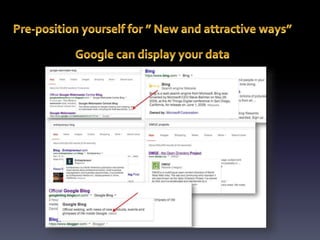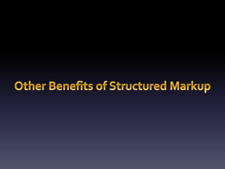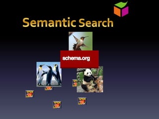 The document discusses the evolution of search engines from basic keyword search to semantic search using knowledge graphs and structured data. It provides examples of how search engines like Google are now able to provide direct answers to queries by searching structured data rather than just documents. It emphasizes the importance of representing web content as structured data using schemas like schema.org to be discoverable in semantic search and knowledge graphs.