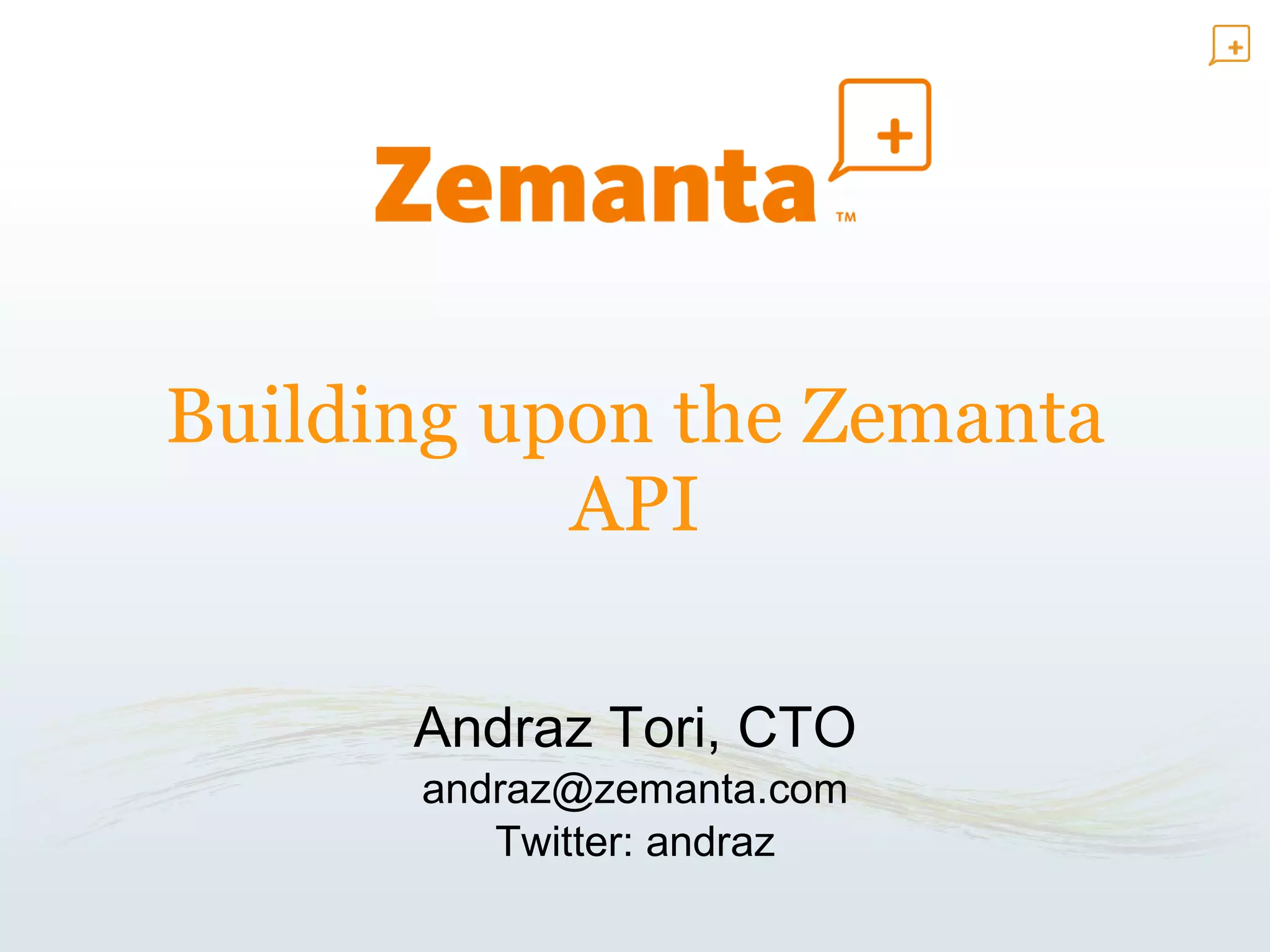 The document provides an overview of the Zemanta API, which processes text to extract semantic information like tags, categories, concepts, entities, and related articles and images. It analyzes natural language to identify meaningful data that can then be linked to external databases. The API aims to bridge human understandable text and computer-processable data through natural language processing and knowledge extraction techniques. It has a variety of uses including content discovery, automatic information delivery, and linking data across information networks.