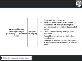 The document outlines the SEN/D (Special Educational Needs/Disabilities) context in a school with over 300 students on the SEN register, significantly above the national average, detailing challenges such as high absence and exclusion rates. It emphasizes the importance of inclusion, differentiated instruction, and collaboration among teachers and support staff to address diverse student needs. Additionally, the text provides strategies for effective teaching and support within the framework of new SEN/D policies, focusing on monitoring and responding to student progress.