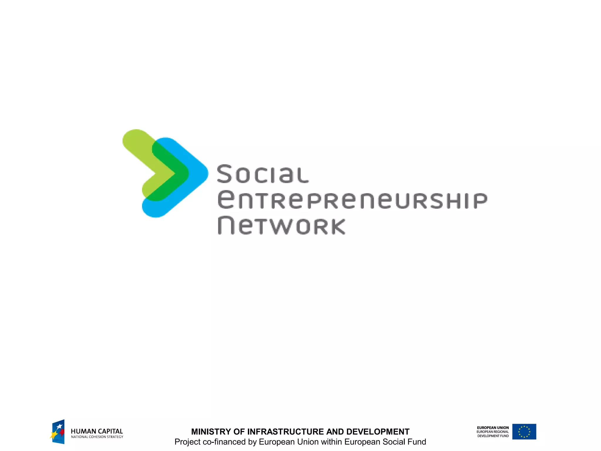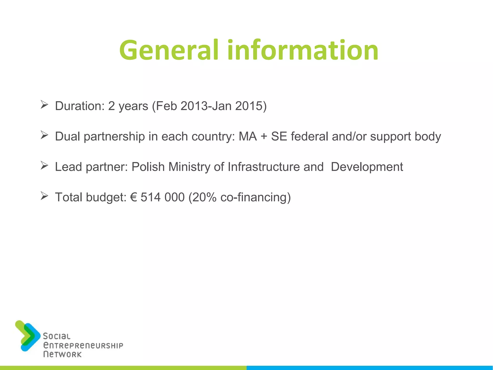 The document outlines a two-year EU co-financed project aimed at promoting social enterprises across multiple countries with a total budget of €514,000. It details the collaboration between various ministries, organizations, and networks to identify best practices, support policy planning, and build capacity within the social economy. Key challenges include developing effective partnerships, improving representativeness, and creating a robust financial ecosystem for social enterprises.