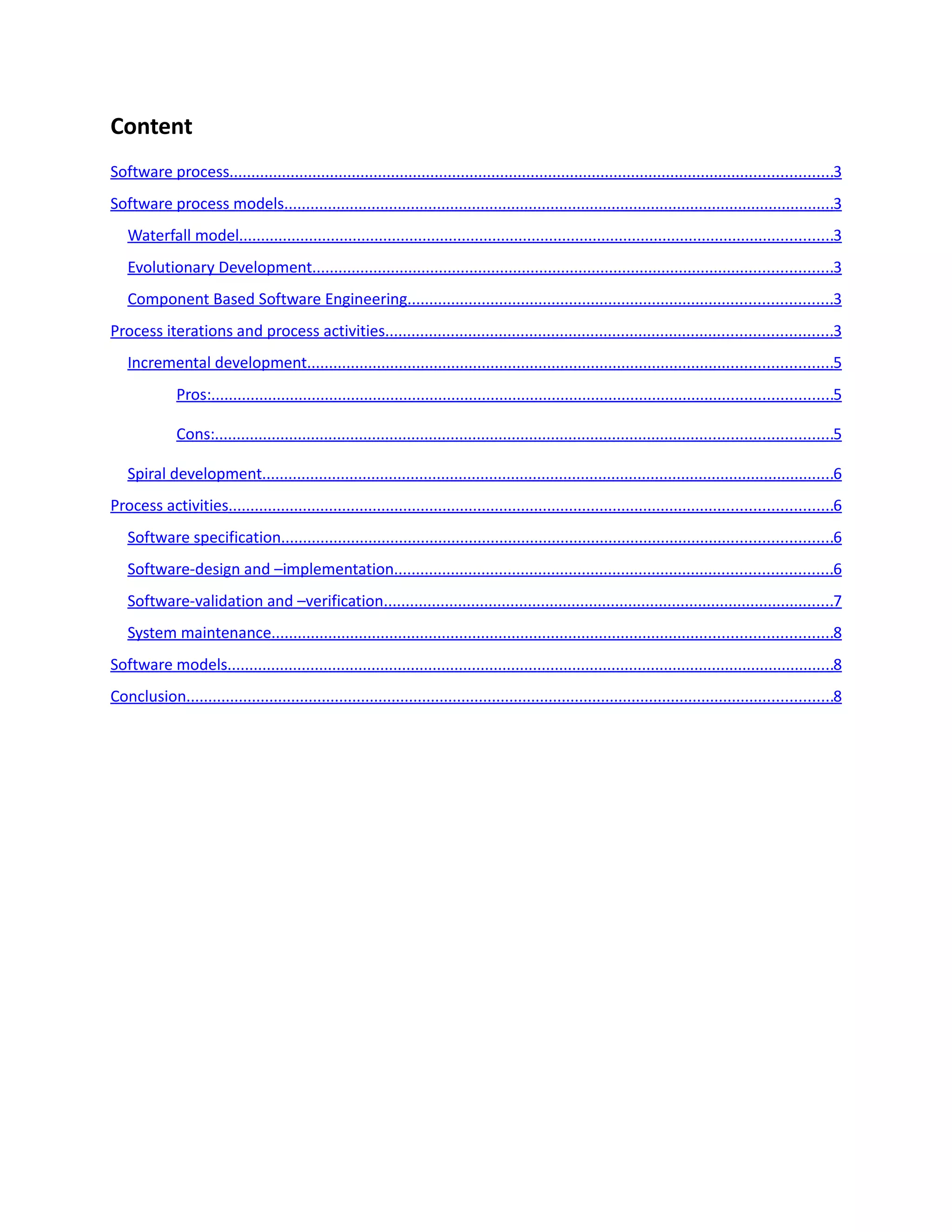 The document discusses software processes and process models. It describes the waterfall model, evolutionary development, and component-based software engineering. It also covers process iterations, activities like specification, design, implementation, validation, and maintenance. Incremental and spiral development are iterative process models. Overall the document aims to explain how software process models can help structure software development and reduce risks.